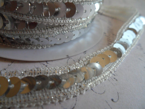 1/2" Wide Silver Sequin Ribbon Trim with Metallic Stitched Edging