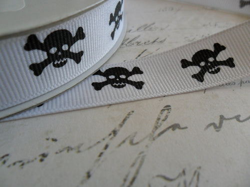5/8 Inch Wide Black Skull on White Grosgrain Ribbon Trim