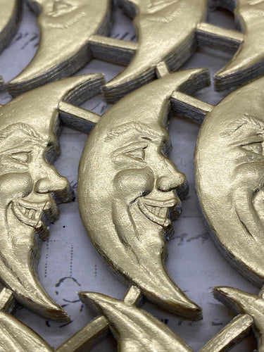 6 Sweet Metallic Gold Vintage Style Dresden Smiling Crescent Moon German Scrap