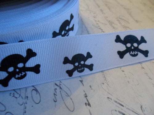 7/8 Inch Wide Black Skull on White Grosgrain Ribbon Trim