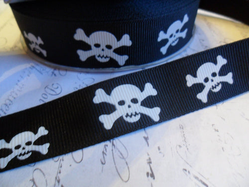 7/8 Inch Wide White Skull on Black Grosgrain Ribbon Trim