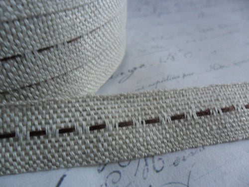 Natural Burlap woven Ribbon with Chocolate Brown Running Stitch 5/8 wide