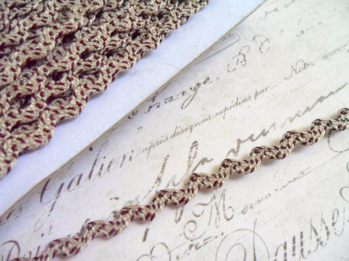 Natural Linen Ric Rac with Chocolate Brown Feather Stitching, 3/8 inch wide