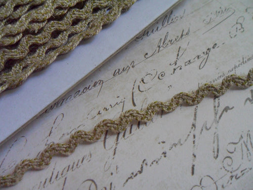 Natural Linen Ric Rac with Moss Green Feather Stitching, 3/8 inch wide