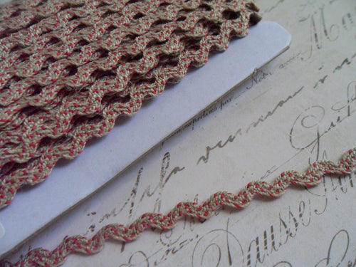 Natural Linen Ric Rac with Red Feather Stitching, 3/8 inch wide