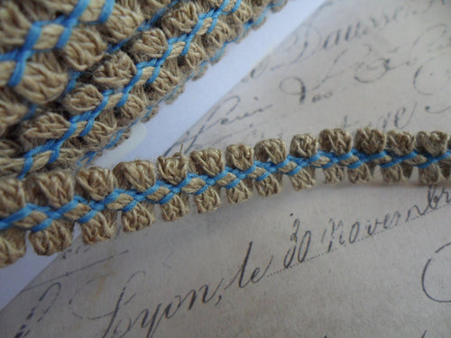 Natural Linen Looped Braid with Decorative Nordic Blue Stitching approx 3/8 inch wide