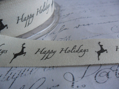 Natural Cotton Canvas 3/4 inch wide Happy Holidays and Reindeer