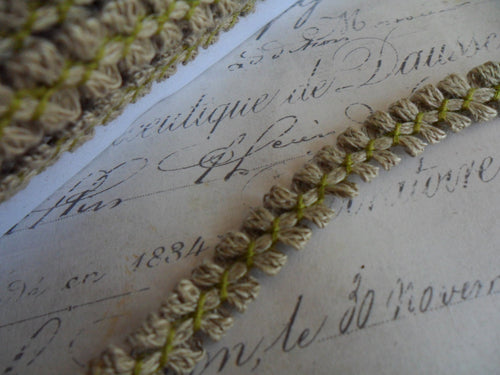 Natural Linen Looped Braid with Decorative Celery Green Stitching approx 3/8 inch wide