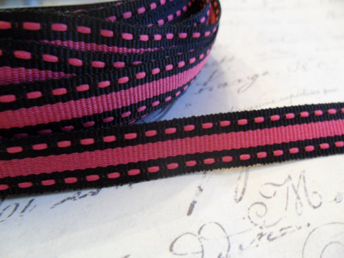 Hot Pink and Black Running Stitch Striped 3/8 wide Grosgrain Ribbon